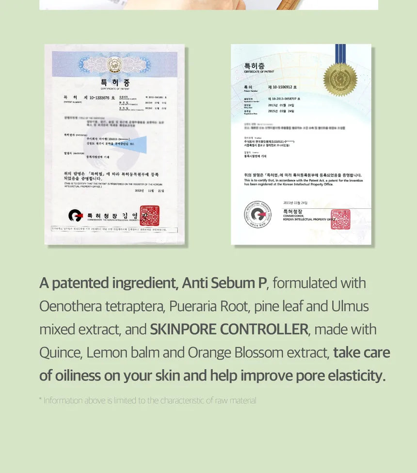 Con ingrediente patentado, Anti Sebum P para mantener el equilibrio agua-aceite y mejorar la elasticidad de los poros.