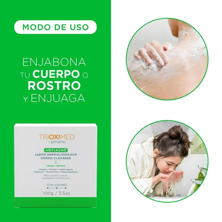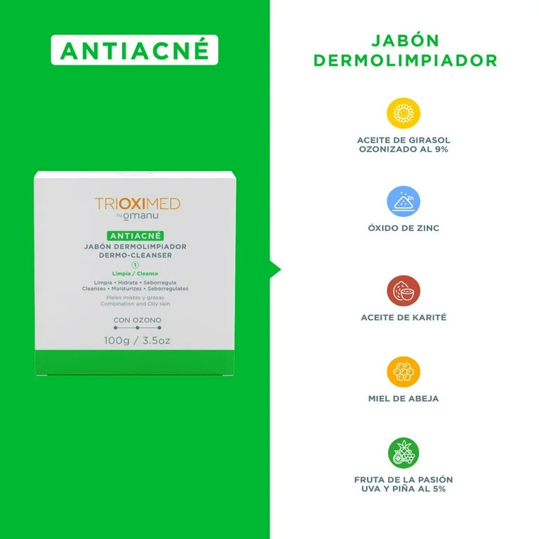 El Trioximed Jabón Antiacné es un dermolimpiador en barra formulado especialmente para pieles con tendencia acneica. Limpia profundamente sin resecar, controla el exceso de grasa, combate bacterias causantes del acné y favorece la regeneración de la piel. Gracias a sus ingredientes naturales con propiedades antimicrobianas y antiinflamatorias, es ideal para usar diariamente en el rostro y el cuerpo.